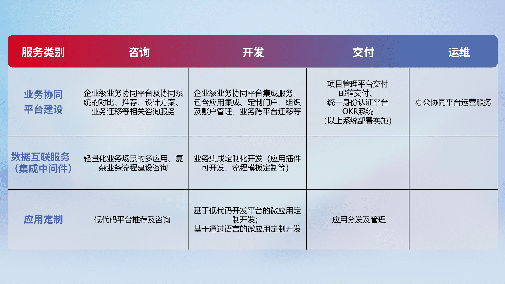 针对钉钉、、、企微、、IDaas等平台级产品提供产品的规划、、、方案、、交付、、、、定制化开发等服务,,实现如统一协同办公、、、智能客户服务、、混合会议管理、、、、智能数据查询、、、、等业务场景,,,实现数字化转型。。。