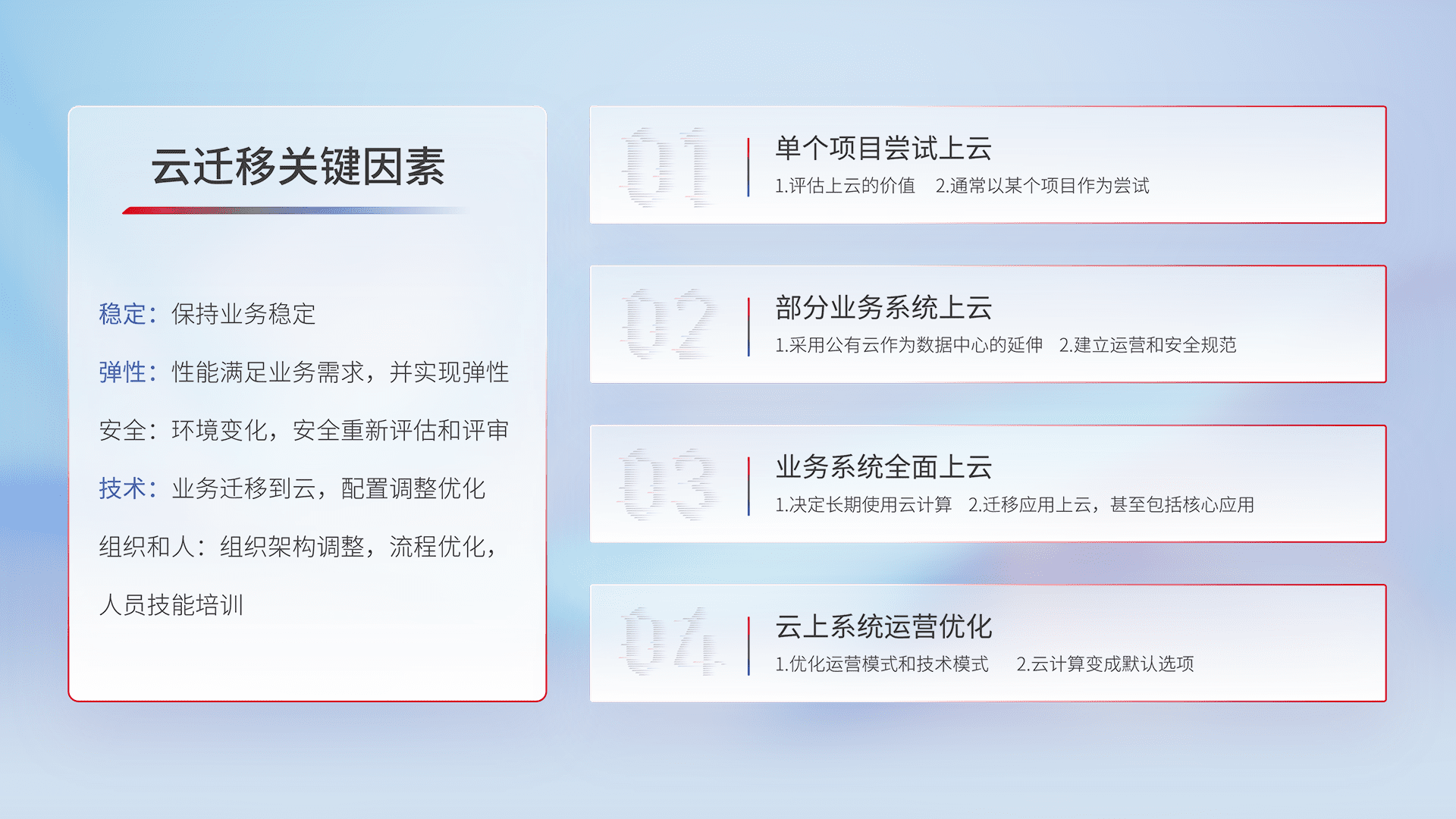 结合实际业务,,从规划设计、、、、云平台选型、、云原生改造、、数据迁移、、、集成交付,,,,迁移全过程为客户识别最佳上云路径,,,做好风险识别管理,,,设计网络架构、、、、身份权限、、、安全审计合规、、操作审计、、日志审计、、、、监控告警策略、、、、多站点容灾设计等,,,,对云上基础设施进行整体规划,,,提升IT治理水平,,,,以满足弹性、、、、高可用、、、高性能的需求。。。