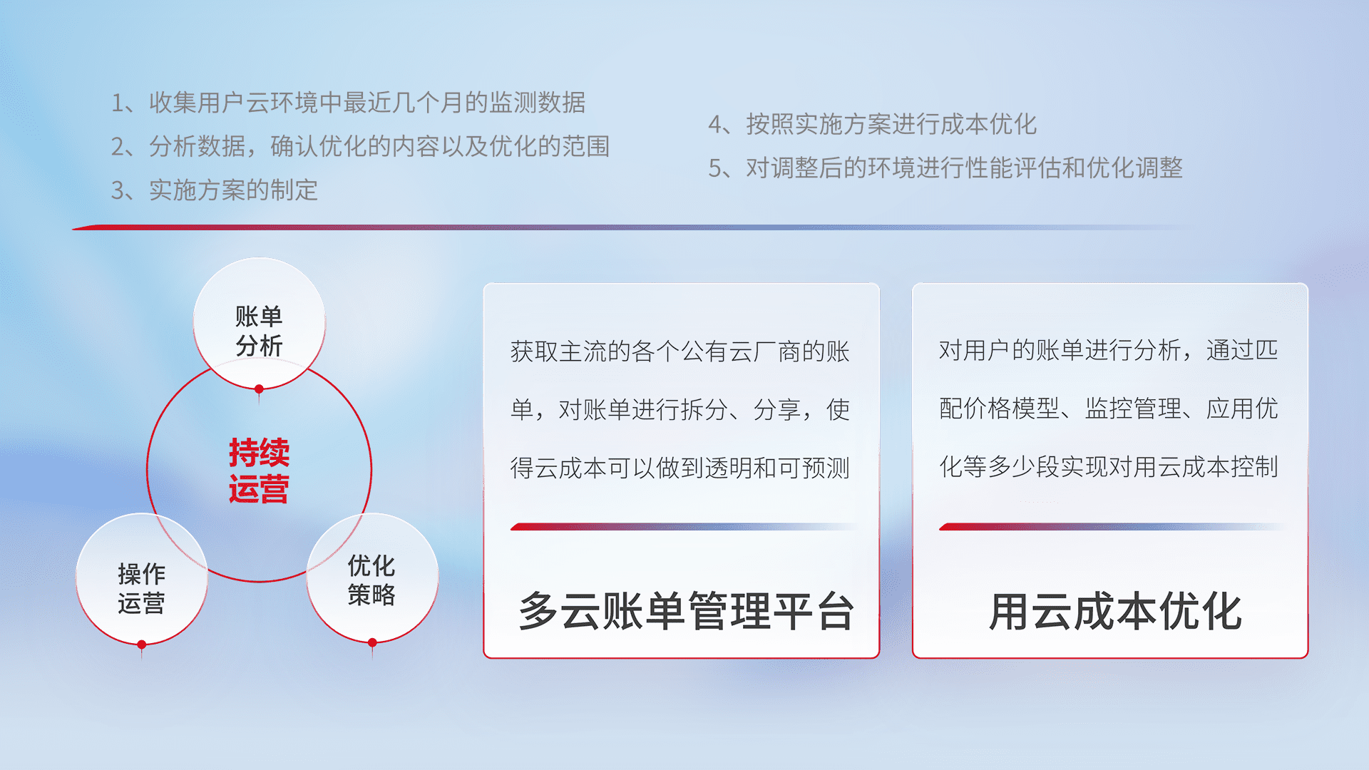 通过多云纳管,,以统一的资源数据模型把客户的云资源进行抽象和封装,,,,进而实现对多云资源的统一操作,,保障云资源管理的可靠性、、、、稳定性与可用性。。。量身定制化运维内容,,,配置、、、、开发运维、、补丁管理、、、备份、、监控、、认证和访问管理、、审计和日常巡检等,,保障在用云过程中的可靠度,,稳定度以及高可用率。。